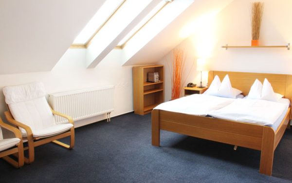 Útulný dvoulůžkový pokoj o velikosti 30 – 55 m² s manželskou postelí. Najdete tu dostatek klidu i pohodlí, koupelnu s vanou nebo sprchovým koutem a televizi. Na přání vám můžeme připravit také přistýlku.