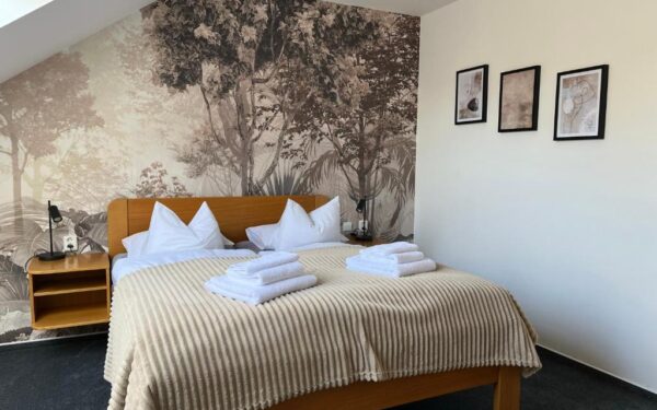 Útulný dvoulůžkový pokoj o velikosti 30 – 55 m² s manželskou postelí. Najdete tu dostatek klidu i pohodlí, koupelnu s vanou nebo sprchovým koutem a televizi. Na přání vám můžeme připravit také přistýlku.